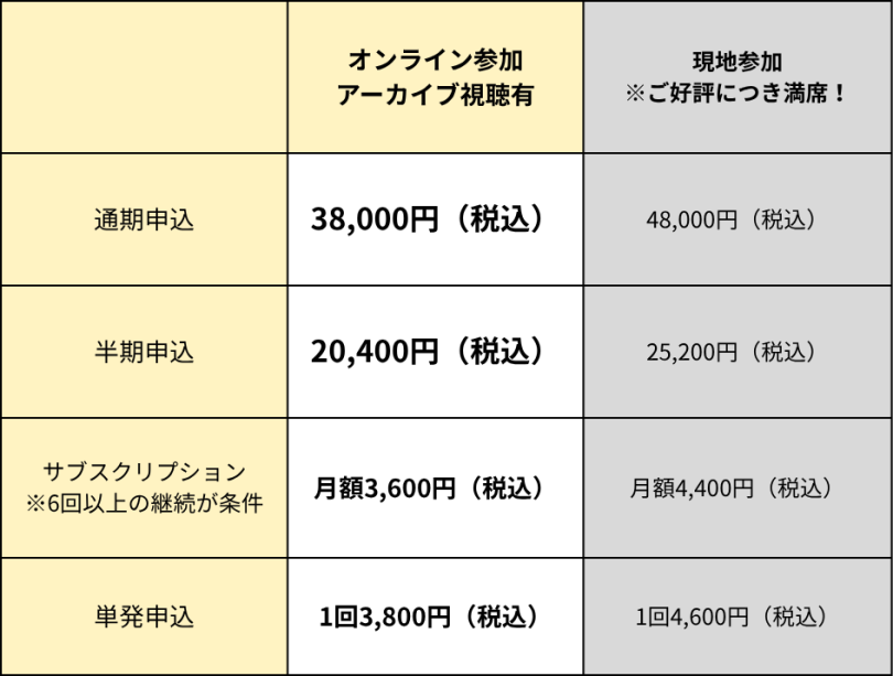 サブスクリプションプラン:こちらのフォームより開始希望月・ご連絡先をお知らせください。現地参加は満席です。
